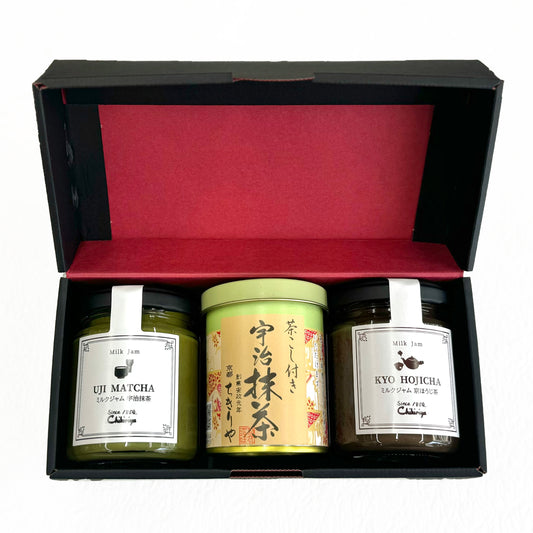 茶こし付き抹茶と、お茶の風味にこだわったミルクジャム2本入りセット。無添加・無着色。